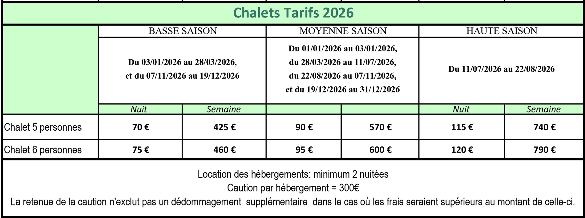 Caution par hébergement: 300€. La retenue de la caution n'exclut pas un dédommagement supplémentaire dans le cas où les frais seraient supérieurs au montant de celle-ci.