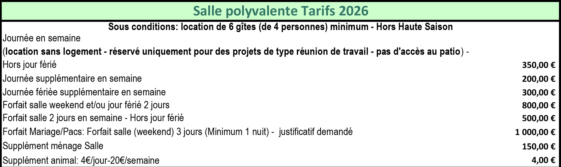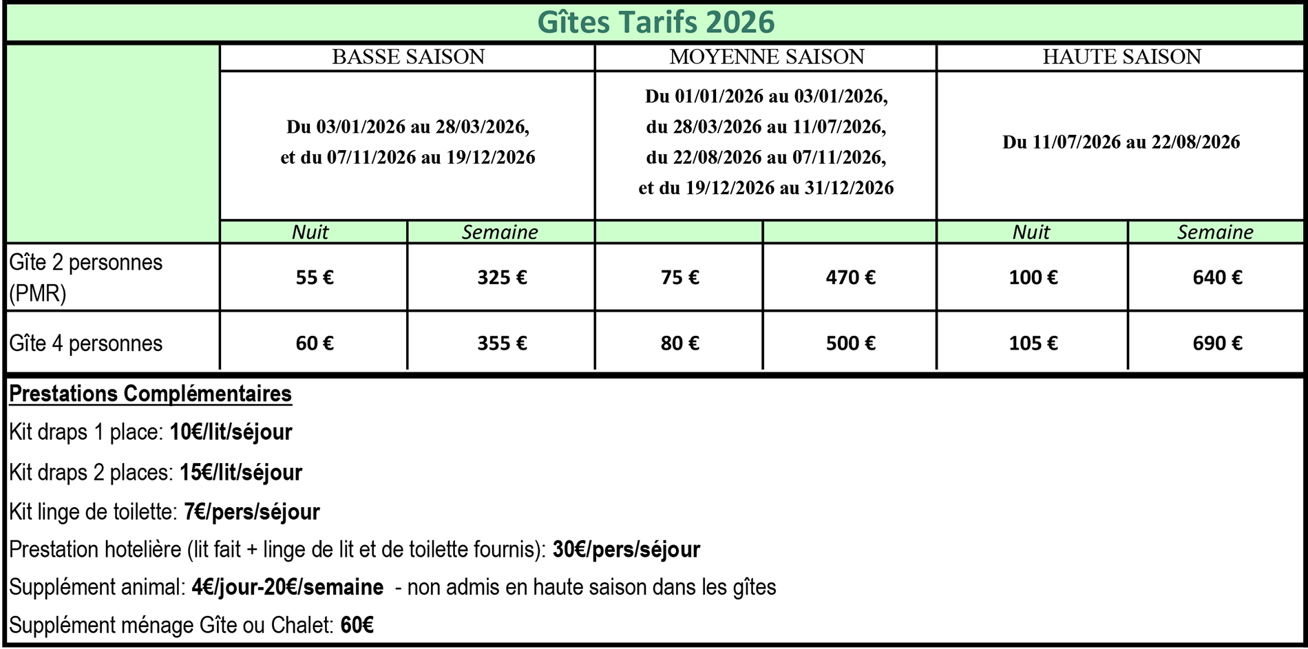 - Supplément animal : 4/jour - 20€/semaine (uniquement hors haute saison)